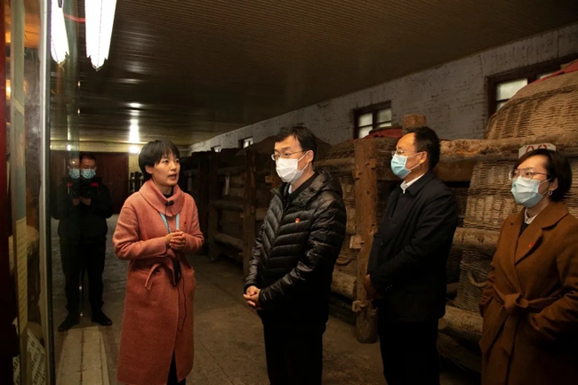 段小龍一行在儲(chǔ)存勾調(diào)車間了解公司對(duì)傳承西鳳酒釀制技藝和大酒海編制技藝人才的的培養(yǎng)措施