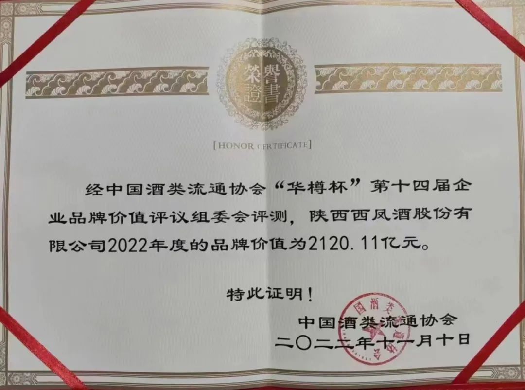 2022年11月10日,“華樽杯”第十四屆中國酒類企業(yè)品牌價值暨第五屆國際酒類產(chǎn)品品牌價值發(fā)布會在貴陽舉行。西鳳酒以2120.11億元的品牌價值名列中國白酒品牌榜前列,被授予“中國最受歡迎鳳香型白酒品牌”、“全球烈酒十強品牌”、“中國陜西省白酒品牌價值第一名”等多項榮譽?!凹t西鳳”以1228.78億元的品牌價值位列全球酒類產(chǎn)品第十三名。