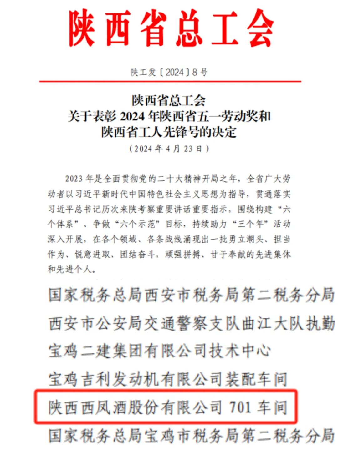 4月23日,陜西省總工會印發(fā)了《關于表彰 2024 年陜西省五一勞動獎和陜西省工人先鋒號的決定》,陜西西鳳酒股份有限公司701車間榮獲陜西省“工人先鋒號”榮譽稱號,受到全省通報表彰。