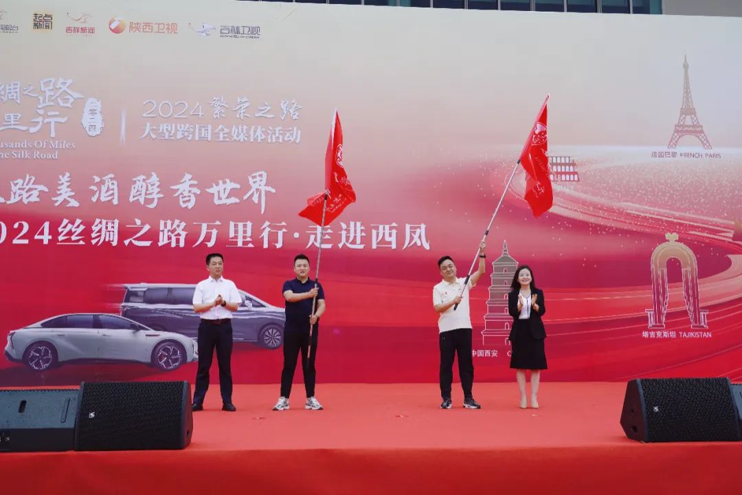 高亞蘭、肖寧為西鳳代表和車隊代表授旗;張凡,馮雅芳為絲路萬里行全媒體團隊長羅強、副隊長楊文萌,以及8名團員代表敬壯行酒。